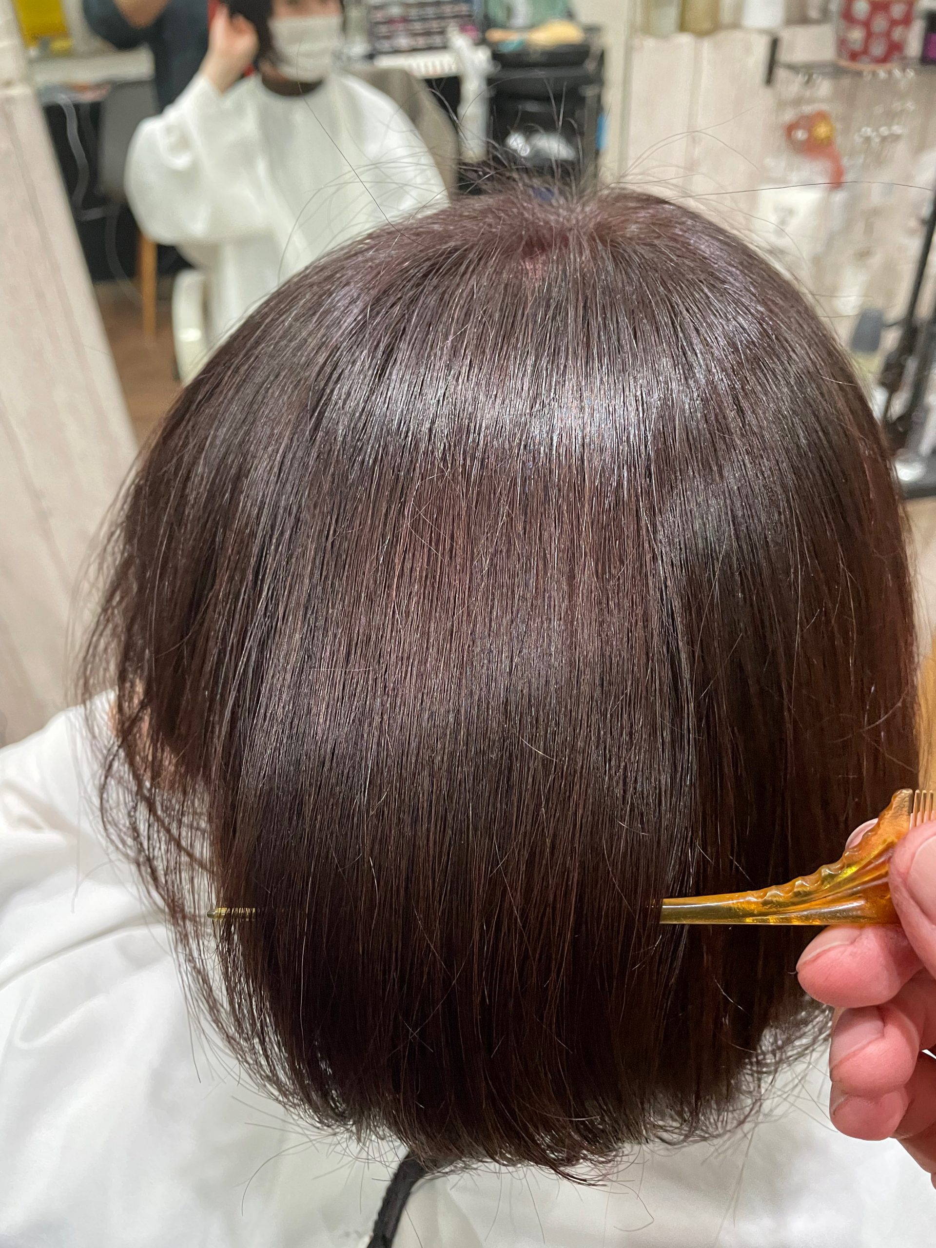 こちらのお客様をカットし、そしてカラーはスロウマージのモーブヴァイオレットにtintbar ベリーベリーピンクを2:1で調合してカラーをします。