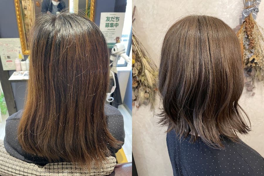 このようにオレンジみを消して透けるような透明感アッシュに。
