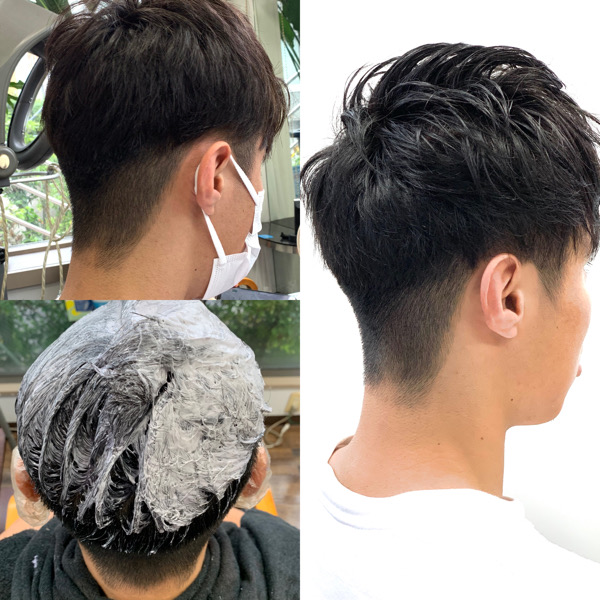 ハイライトが入っていた為ハイライトを濃いブルーブラックで染める事で重く見えない暗髪カラーになります