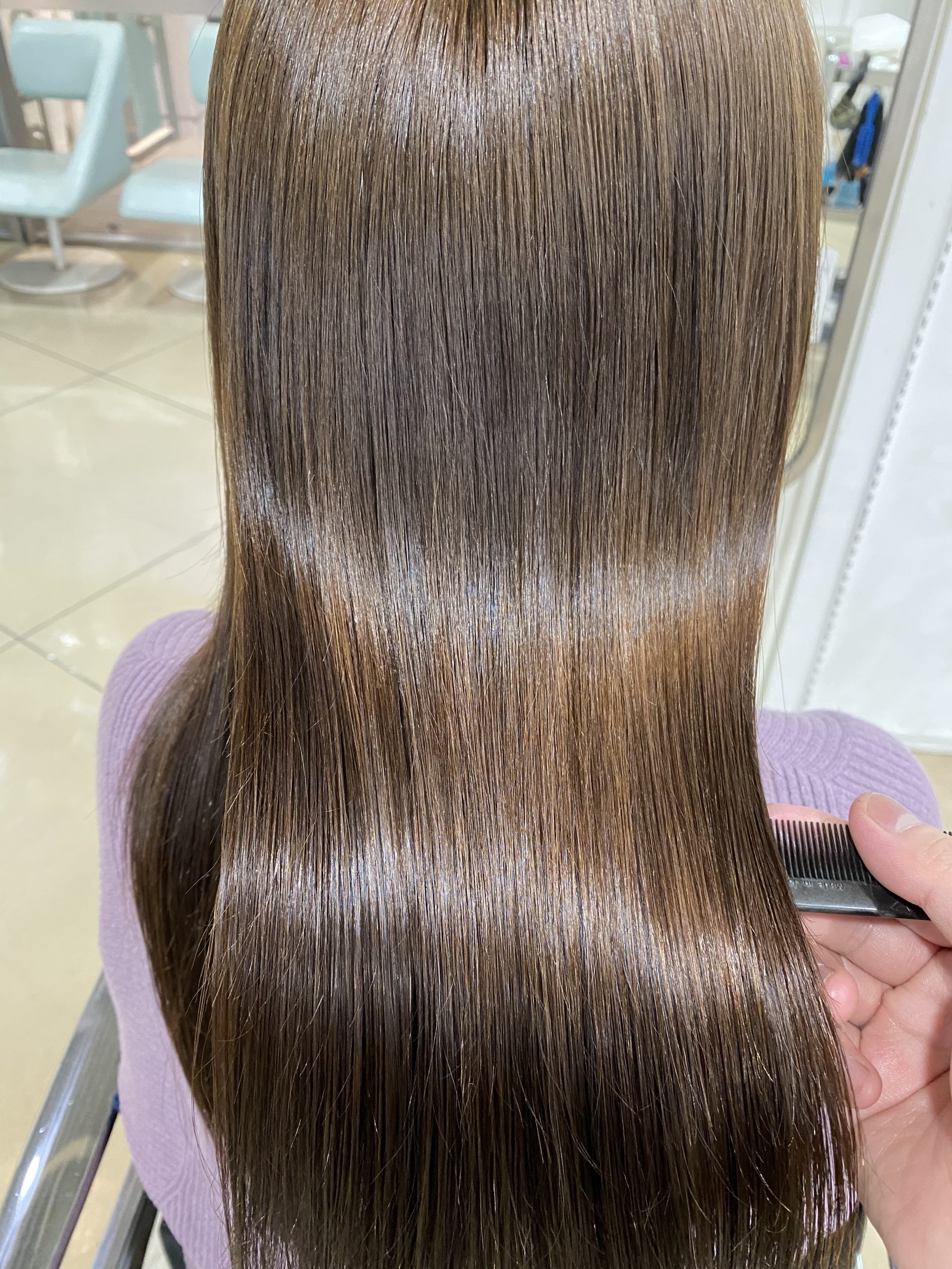 髪質改善ケアをしながらカラーをさせていただく事で、ほのかなピンクが艶やかに出るように施術しています。