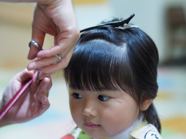 髪の毛が顔にかかりますが、頭をまっすぐにして切ることが大事です。