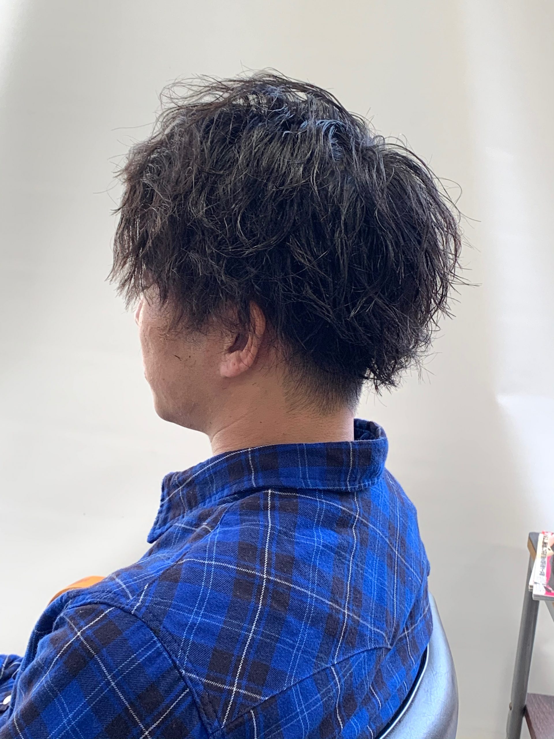 ここまで伸びれば結ぶことも可能ですが髪の毛が鬱陶しいとの事なのでツイストパーマがギリギリ残るラインでカットします。
