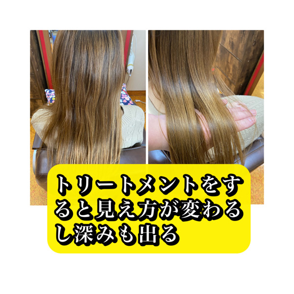 見た目が綺麗なのは、ストレートアイロンをしているからなのもありちゃんとここでカンセリングをしないとダメージの進行を止めれないのでbeforeの写真を見ての確認すると目で見たよりも写真を撮った時の方が傷みがよくわかるのでお客様にトリートメントをオススメする理由をカンセリングする際に活用できます。