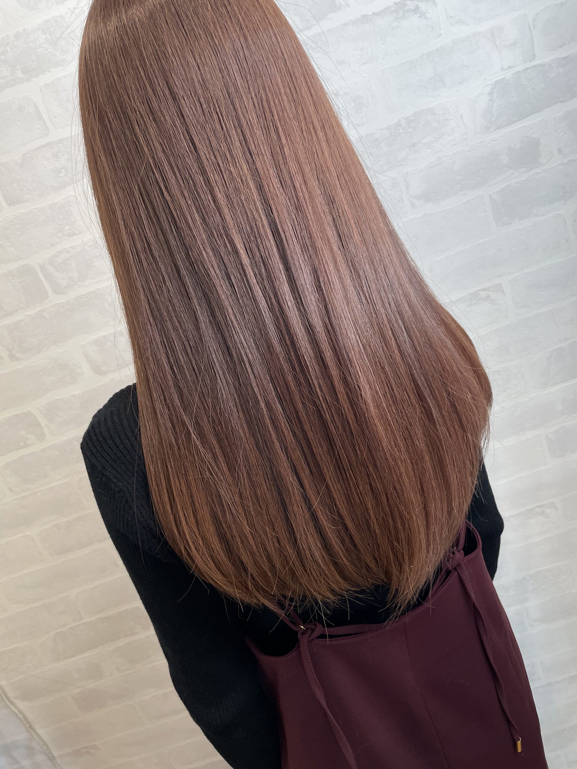 今回のお客様は、毛先にブリーチ履歴のある方であまり暗くせず柔らかいピンクベージュがご希望でした。