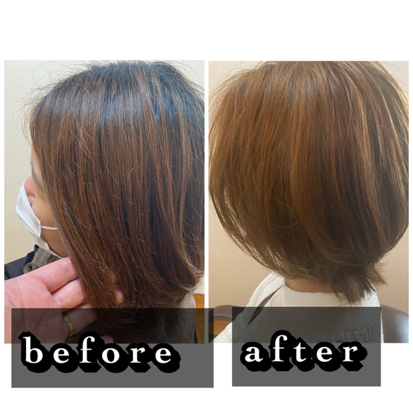 before を見ると、褪色後髪色がくすんで見えているので暗めにするとよりイメージが重く見やすくなるので