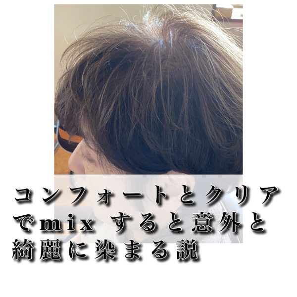 今回は、伸びてきた根元だけ染めて毛先の白髪の部分はハイライト風に仕上げているのでコンフォートをクリアで混ぜると暗くなりすぎないので
