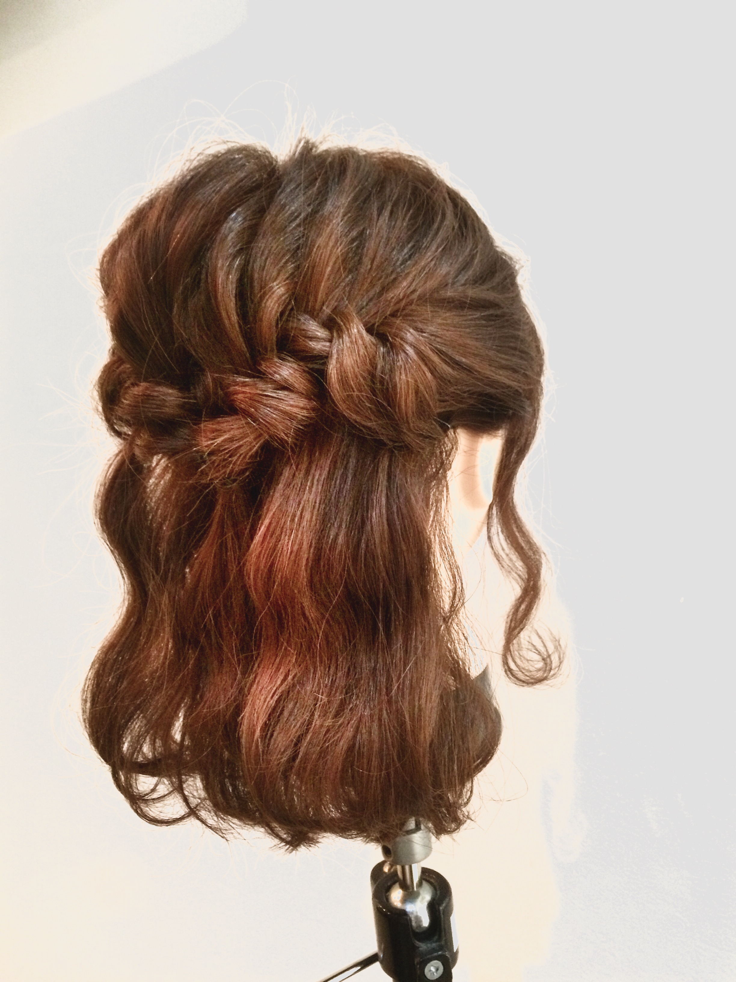 1 耳から上の髪の毛をフィッシュボーン編み込みします。後頭部までいくとゴムで結んでおきます。逆側も同じです。