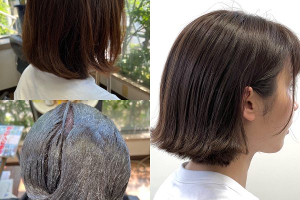 ブリーチ無しの暗めアッシュベージュで赤味を抑えます