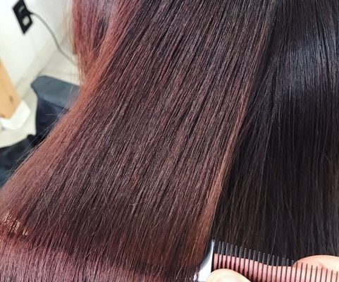 くせ毛で広がりが気になる方の【くせ毛カットとツヤ髪チェリーレッド】