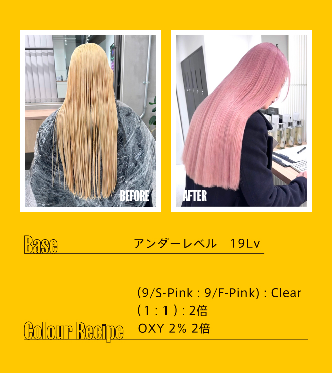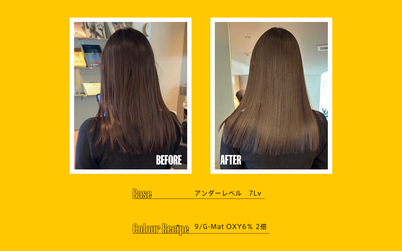 BASIC LINEと重複する色味(DG・JP・FP・DO・CB・CG)は、ブリーチアンダーにムラがある場合はBASIC LINE、ムラが少なく整ったアンダーの場合はON COLOUR LINEを使用し、使い分けが可能。 -