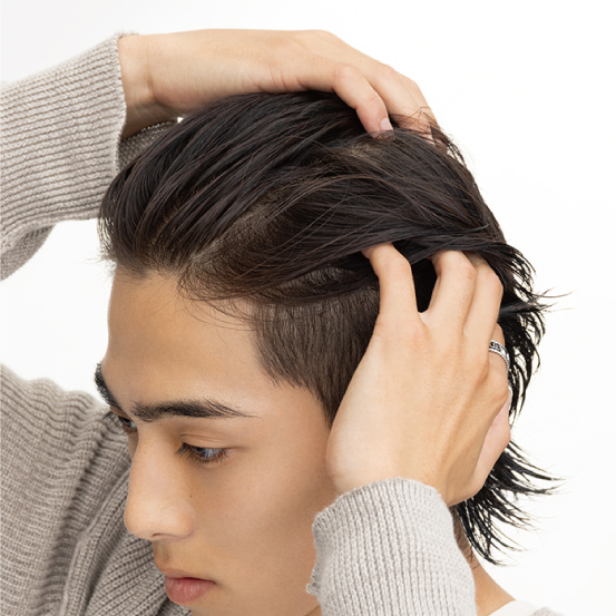 Hair Style かきあげサイドパート 使用アイテム オイルグリース HOW TO <前処理>ドライヤーで分け目をあらかじめ分けておきます。 指の間までしっかりのばし、 かき上げるように根元から塗布して毛流れを作ります STYLIST 梅村 尚輝 / 店長 Un ami omotesando / 東京