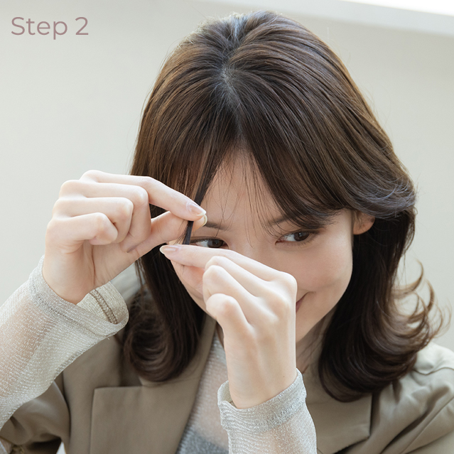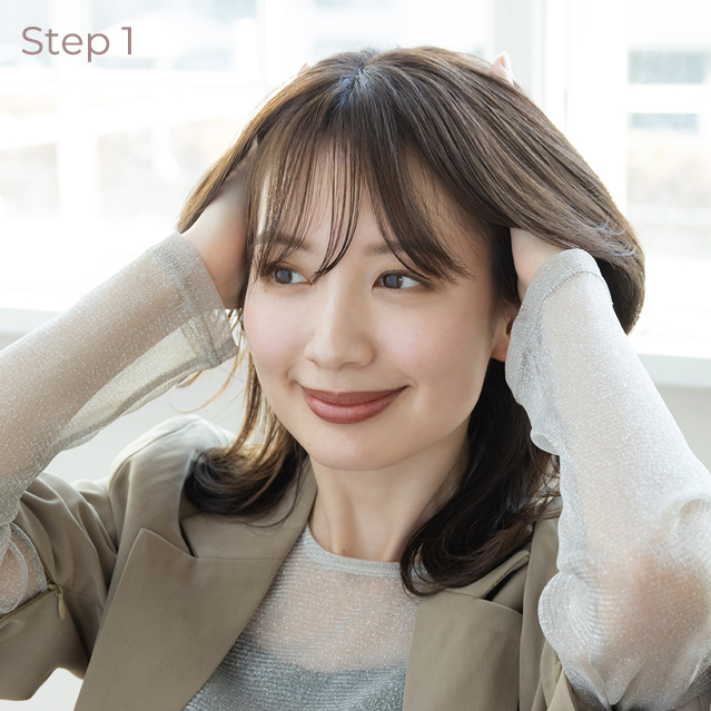 手のひらに適量のばし、内側からしっかりつけます。 その後、耳上を立ち上げるようにつまみながら整えます。