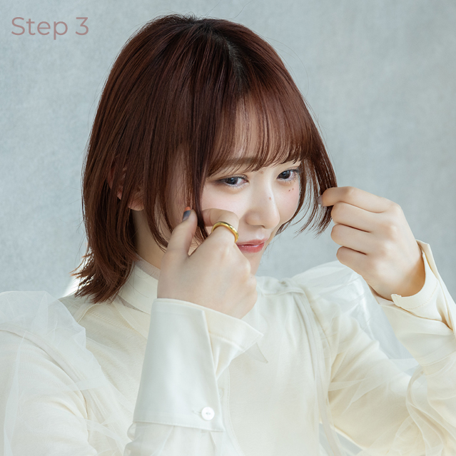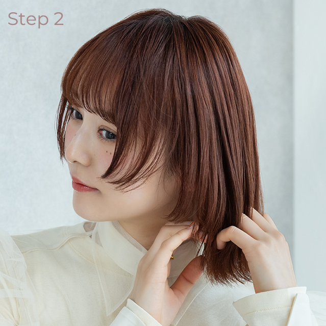 全体をストレートアイロンで外ハネにし、顔周りのみ内巻きにしておきます。
