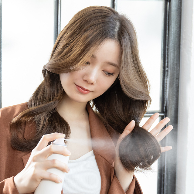 10-15cm離して全体にスプレーし、 軽くコームでとかしてからアイロンで巻くとスムーズにアイロンが通せます。 よりツヤ感が欲しい部分には重ねて付け足しします。