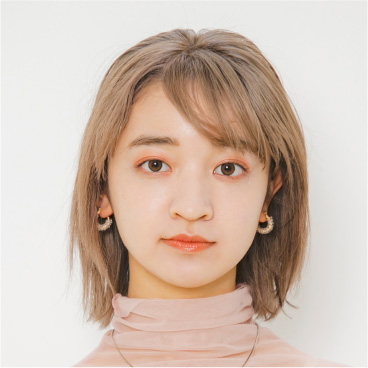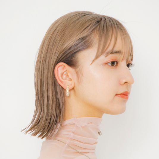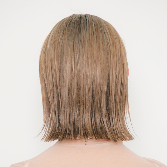 全体を襟足外ハネのストレートにします。前髪も軽くカールさせます。前髪のサイドは横に流します。
