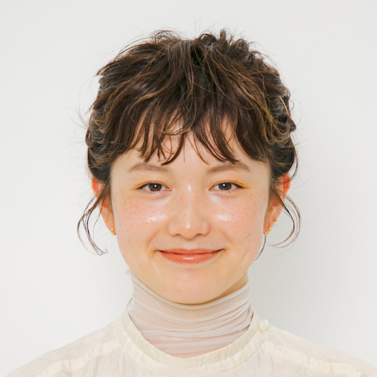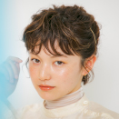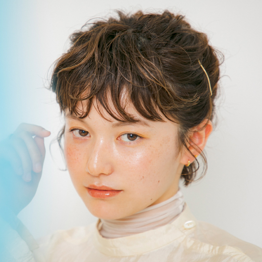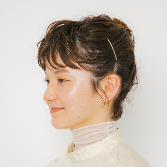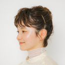 ソフトジェルをパール大ほど前髪に揉みこみ、つまんで立体感を出します。後れ毛、襟足にもつけて全体の質感を整えます。