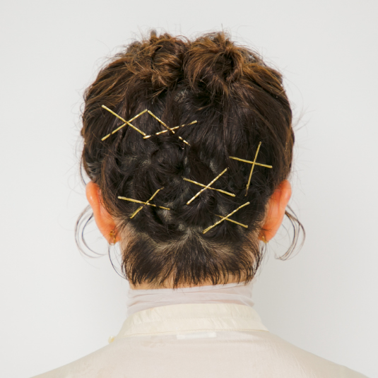 後ろの髪はランダムにねじってピンで留めます。後れ毛を引き出し、サイドはピンで留めます。ハチ部分、サイドの毛を少し引き出して立体感を出します。