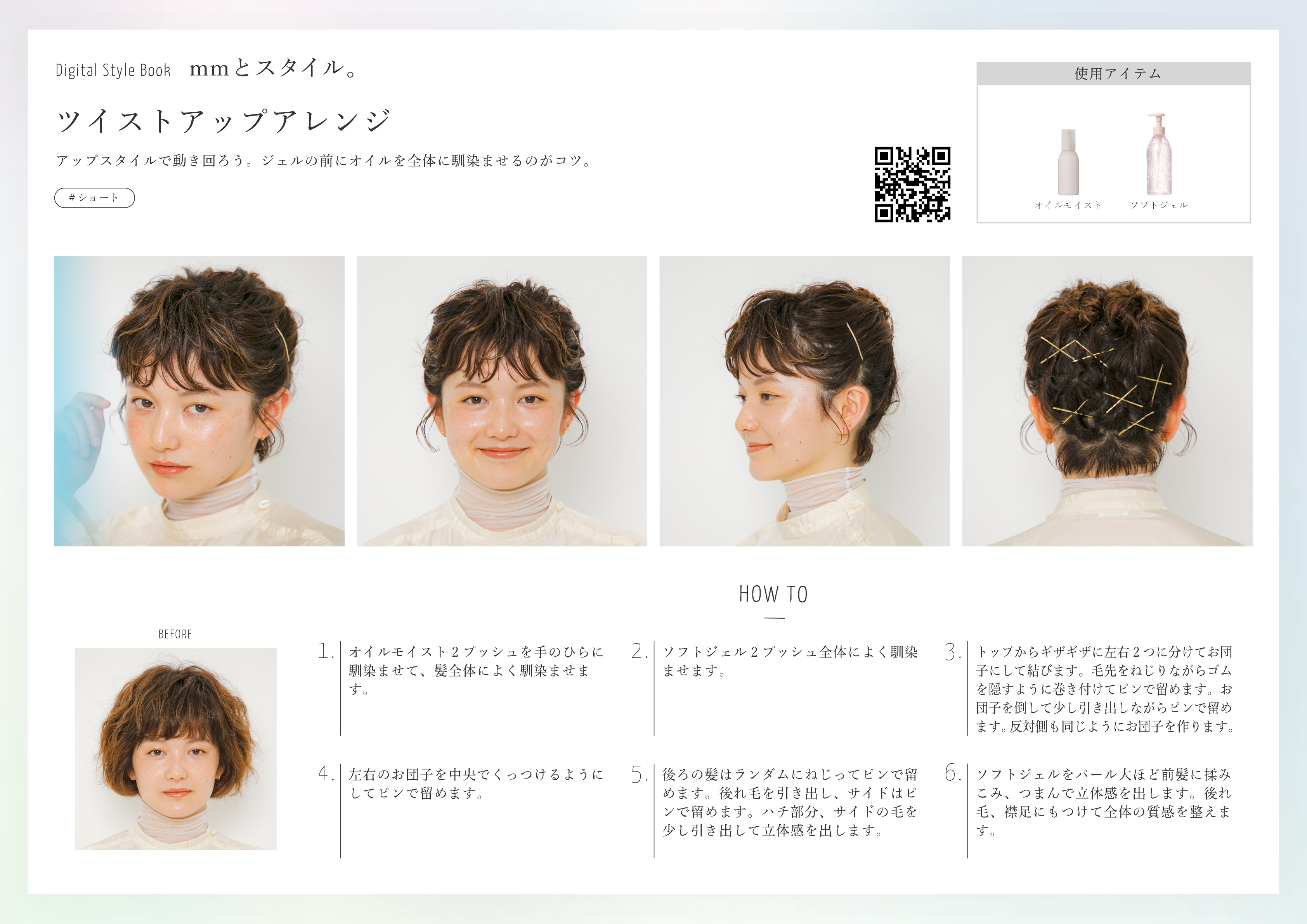 アップスタイルで動き回ろう。ジェルの前にオイルを全体に馴染ませるのがコツ。