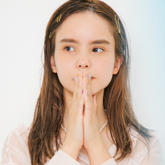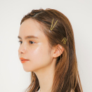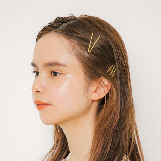 前髪は少し横分けにして、ピンは間隔や向きをランダムにしてつけます。指1本ほど耳周りから離してピンで留めます。