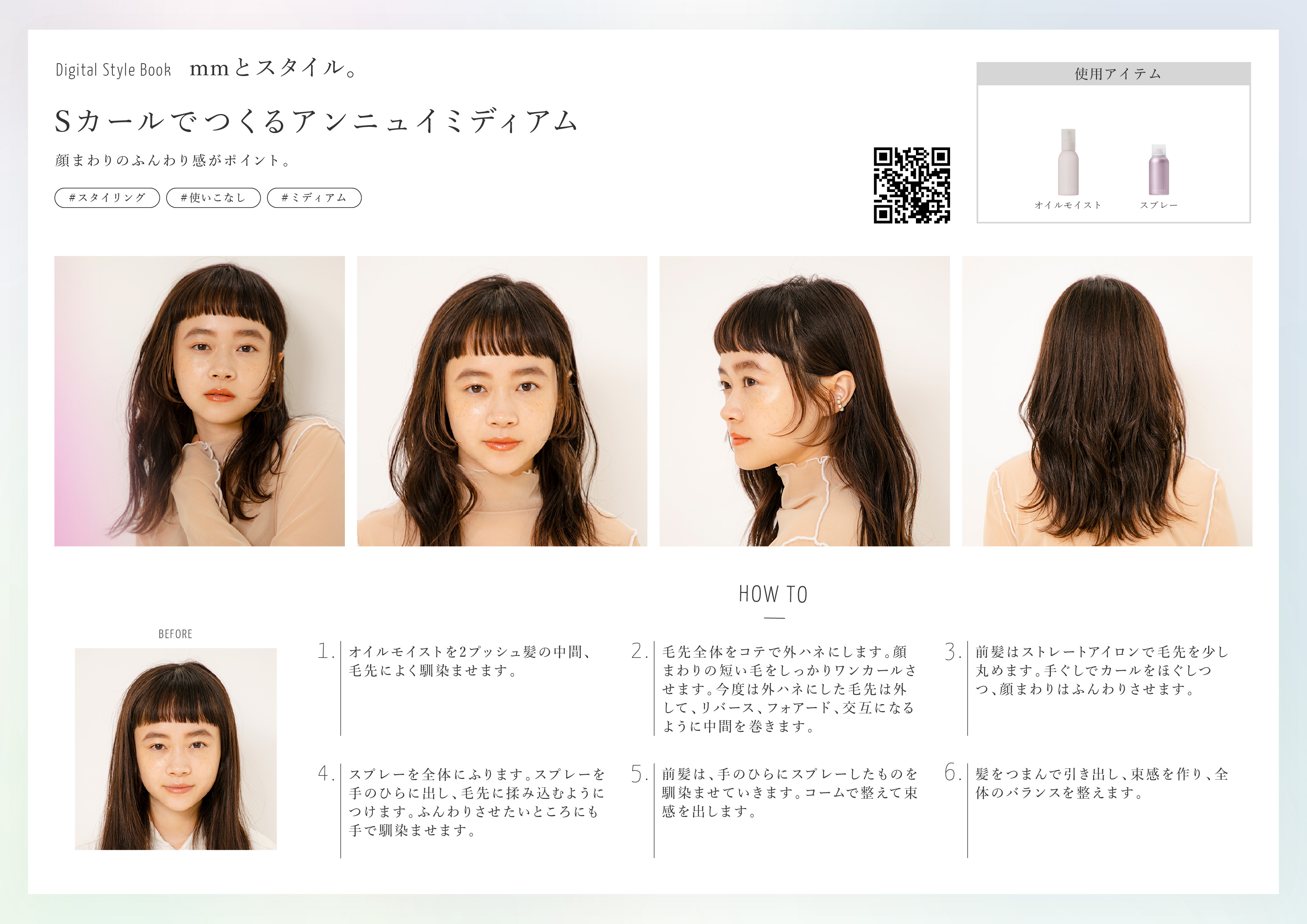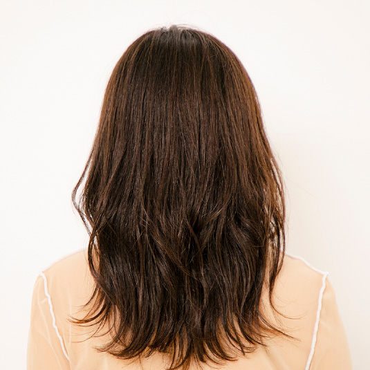スプレーを全体にふります。スプレーを手のひらに出し、毛先に揉み込むようにつけます。ふんわりさせたいところにも手で馴染ませます。