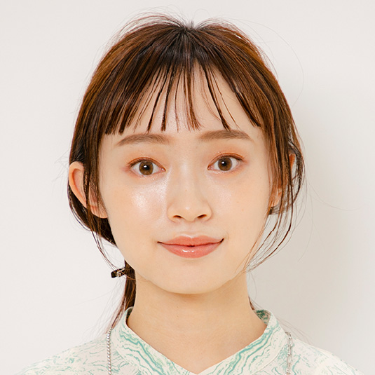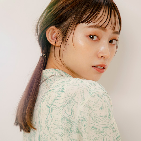 ストレートアイロンで全体の毛先を軽く内巻きにします。前髪は細かく取って軽く内巻きにします。