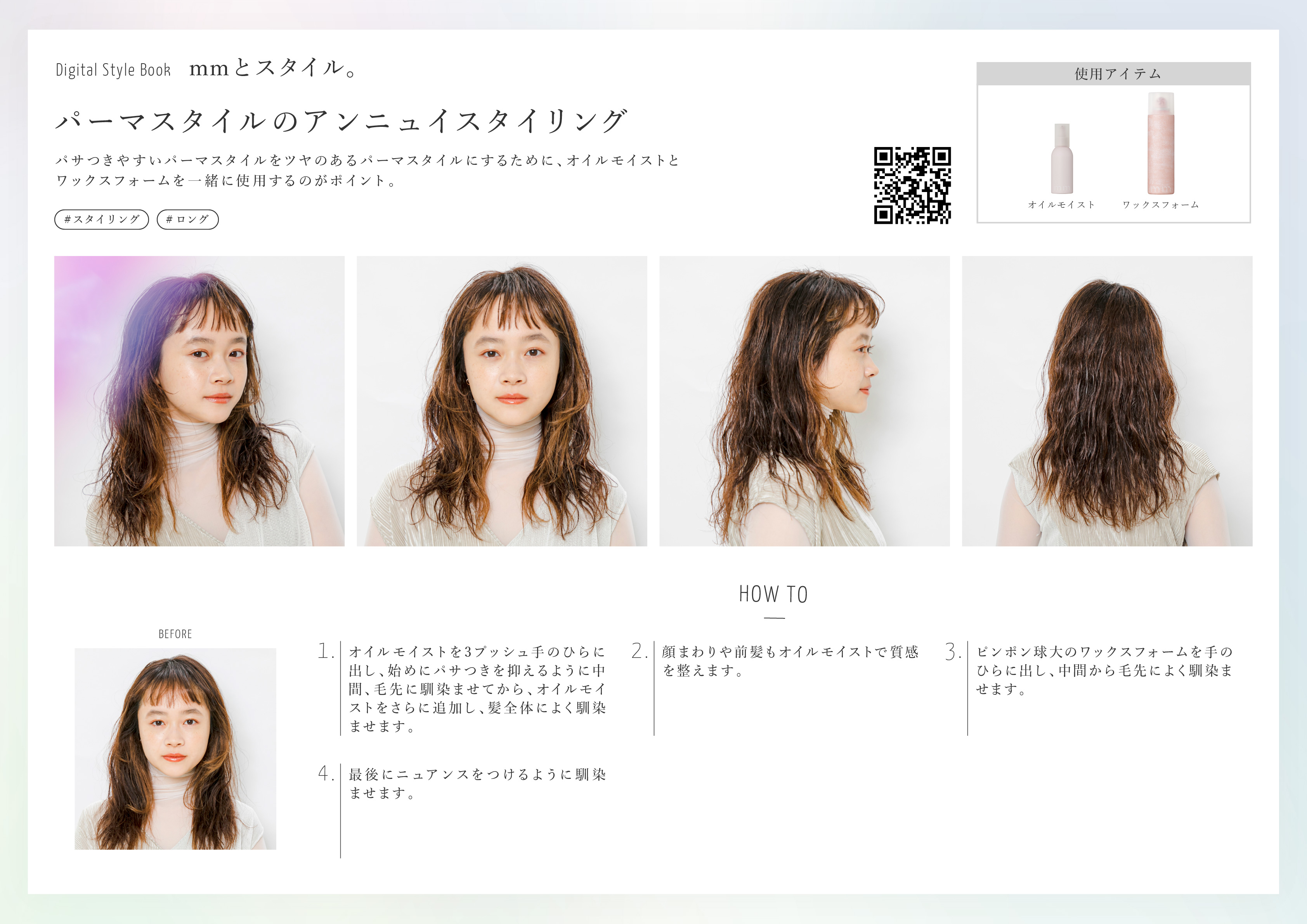 パサつきやすいパーマスタイルをツヤのあるパーマスタイルにするために、オイルモイストとワックスフォームを一緒に使用するのがポイント。
