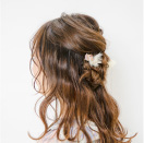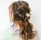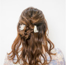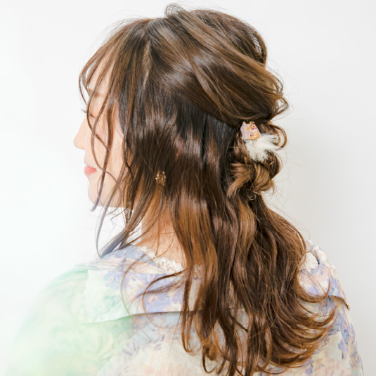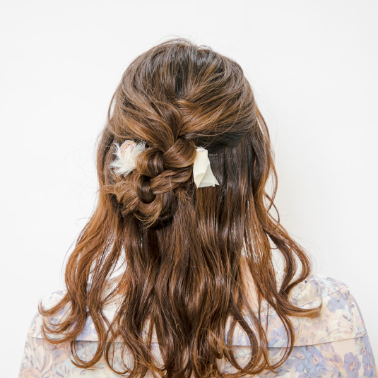 顔まわりを残して、ゆるくハーフアップをするイメージで、始めだけ編み込み、あとは三つ編みをします。最後まで編んだら、大きめにゆるく、全体的なバランスを見て引き出します。毛先をゴムで結び、三つ編みを下にくるっと丸めてピンが見えないように両サイドから留めます。