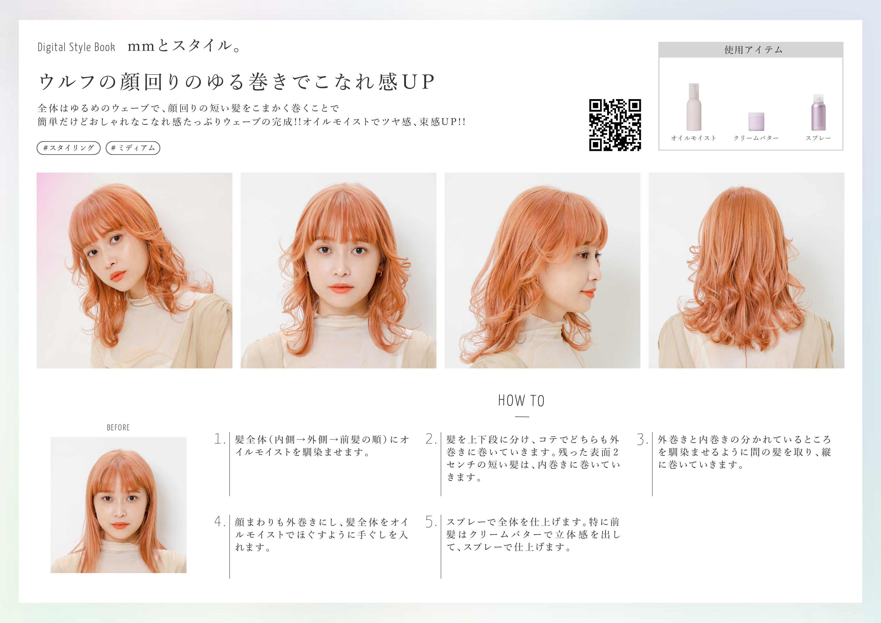 全体はゆるめのウェーブで、顔回りの短い髪をこまかく巻くことで簡単だけどおしゃれなこなれ感たっぷりウェーブの完成!!オイルモイストでツヤ感、束感UP!!