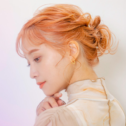 上に止めていた毛束を2つに分けてねじりながらクロスします。毛先はお団子にしてゴムで結びます。左にくるっと回転させながらゴムの周りに巻きつけ、ピンで留めます。お団子から髪を引き出し、崩します。引き出した際にお団子から飛び出した髪はコテで巻いてニュアンスをつけます。