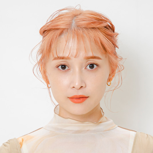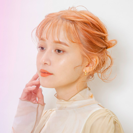 シースルーになるように前髪をギザギザに左右で取り、それぞれ後ろにねじってピンで留めます。引き出してスプレーでツヤを出し、長持ちするようにします。残った顔まわりの後れ毛や前髪は巻いてニュアンスをつけます。クリームバターをパール1個分、手のひらで馴染ませてから前髪に束を作るようにつけます。