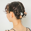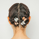 全体を2つに分け、編み込みをして結びます。巻き付けながら、クリップとピンで留めます。