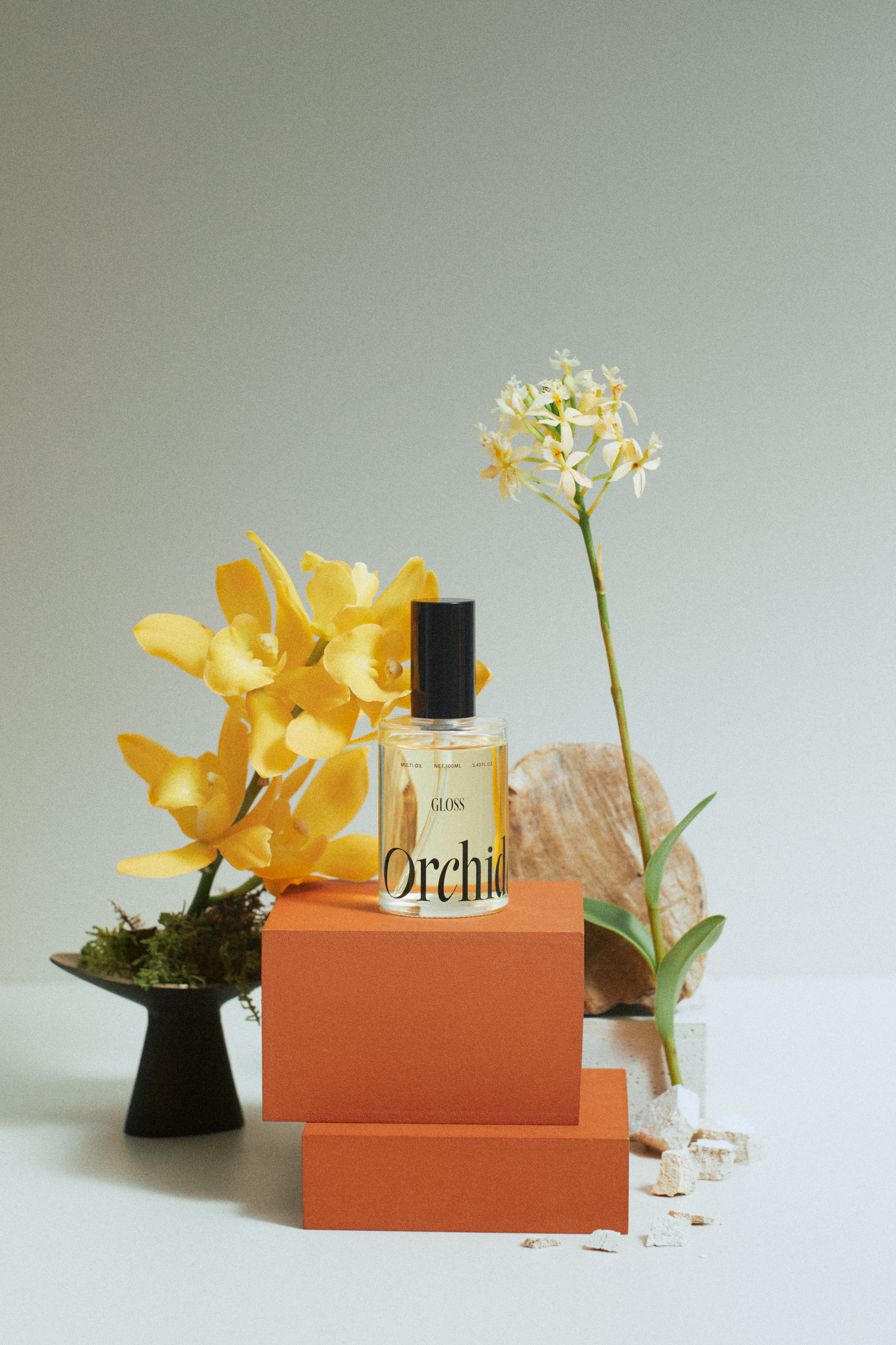 インテリアを邪魔しないスタイリッシュなガラスボトル。それぞれ異なる蘭の花をあしらった華やかなパッケージは、ギフト需要にも対応。