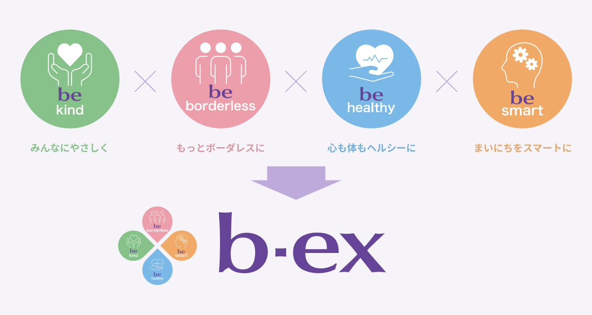 未来に向かって大切にしたい事、4つのbe(なりたい理想像・be=美)を掛け合わすことで「b-exが目指す未来」の形を表現しました。